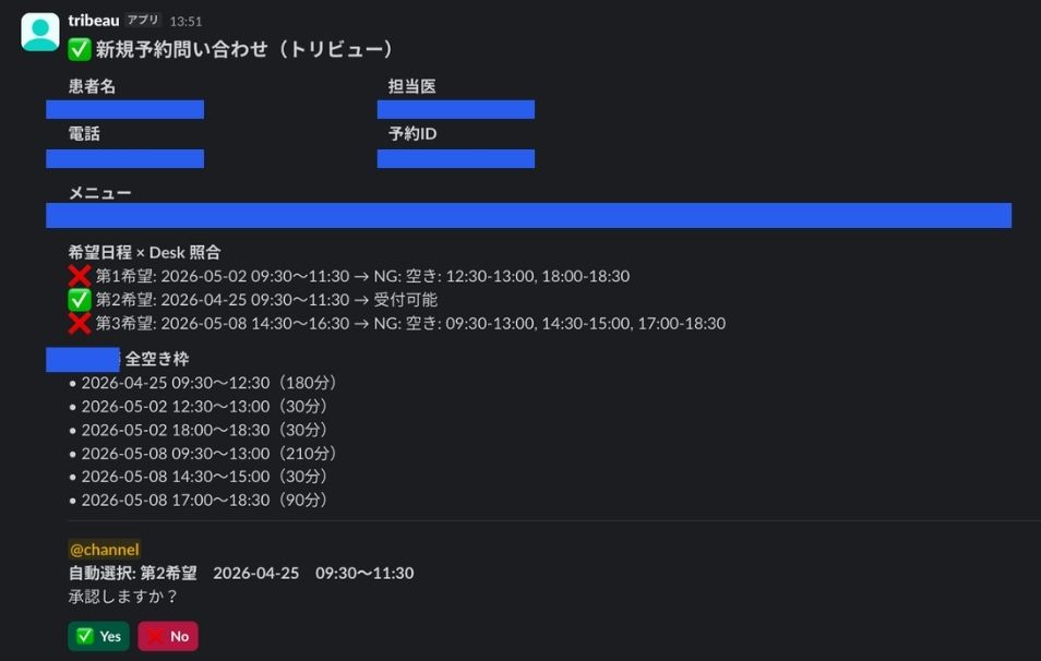 照合結果をSlackに投稿します。メッセージには患者情報、希望日時、提案できる枠、担当医の情報が整理されて表示され、「Yes(この枠で確定する)」「No(スキップする)」の2つのボタンが付きます。